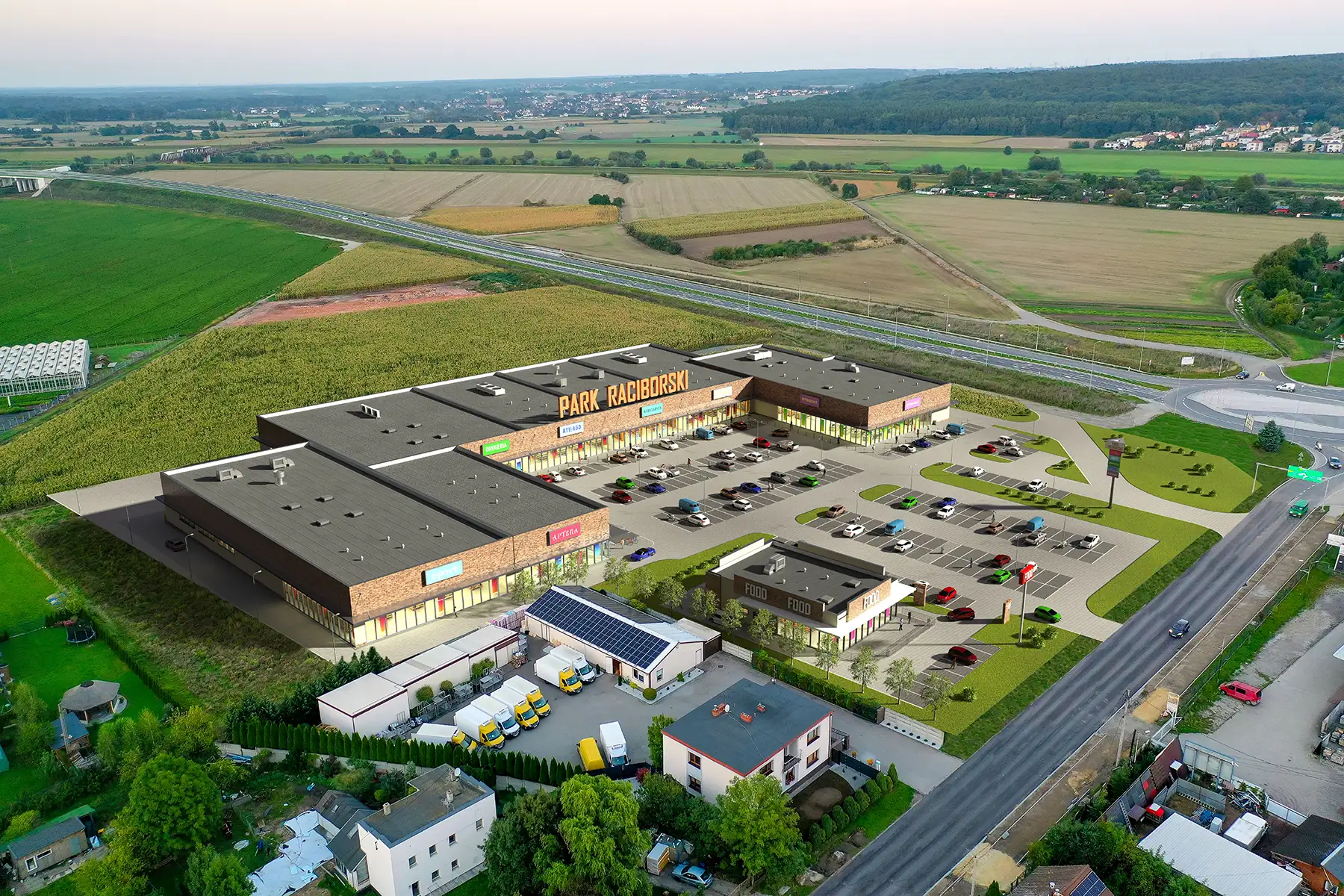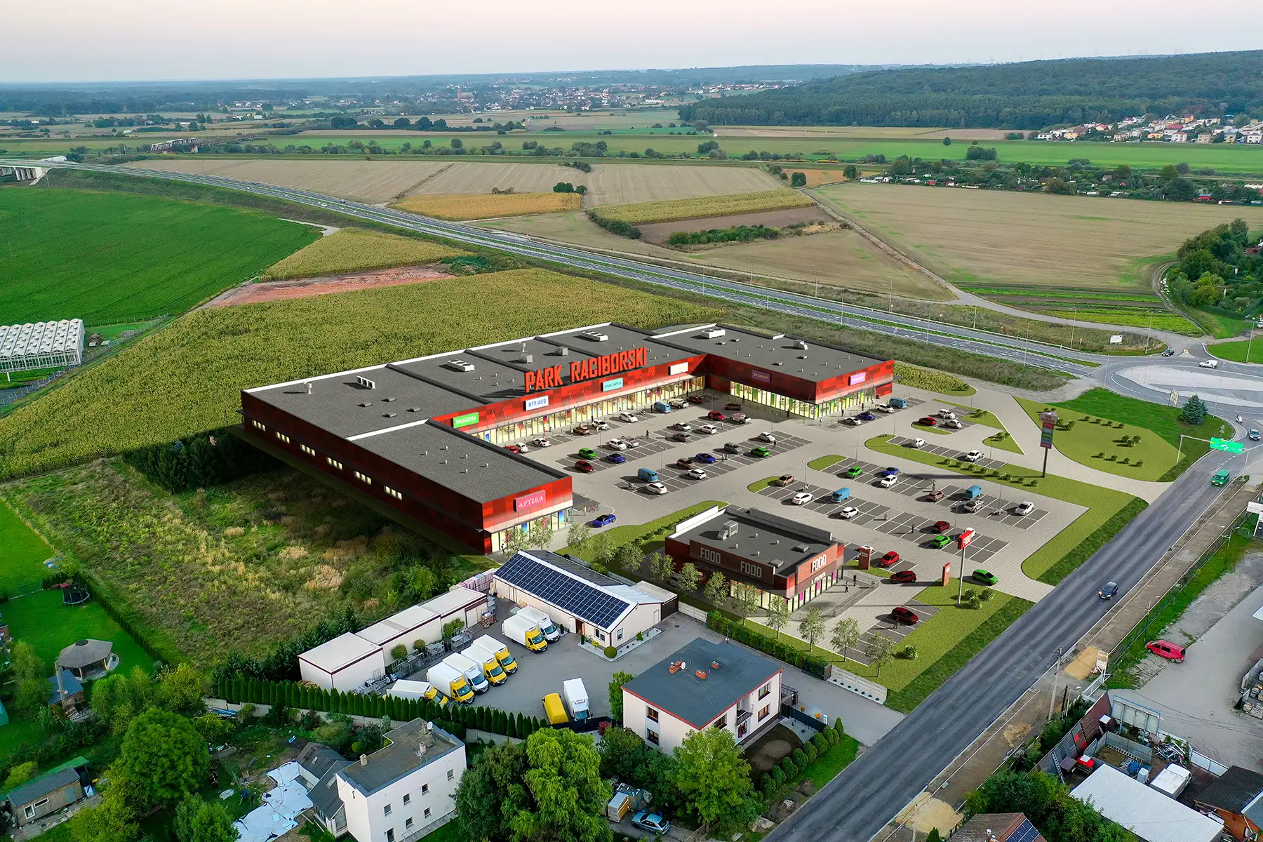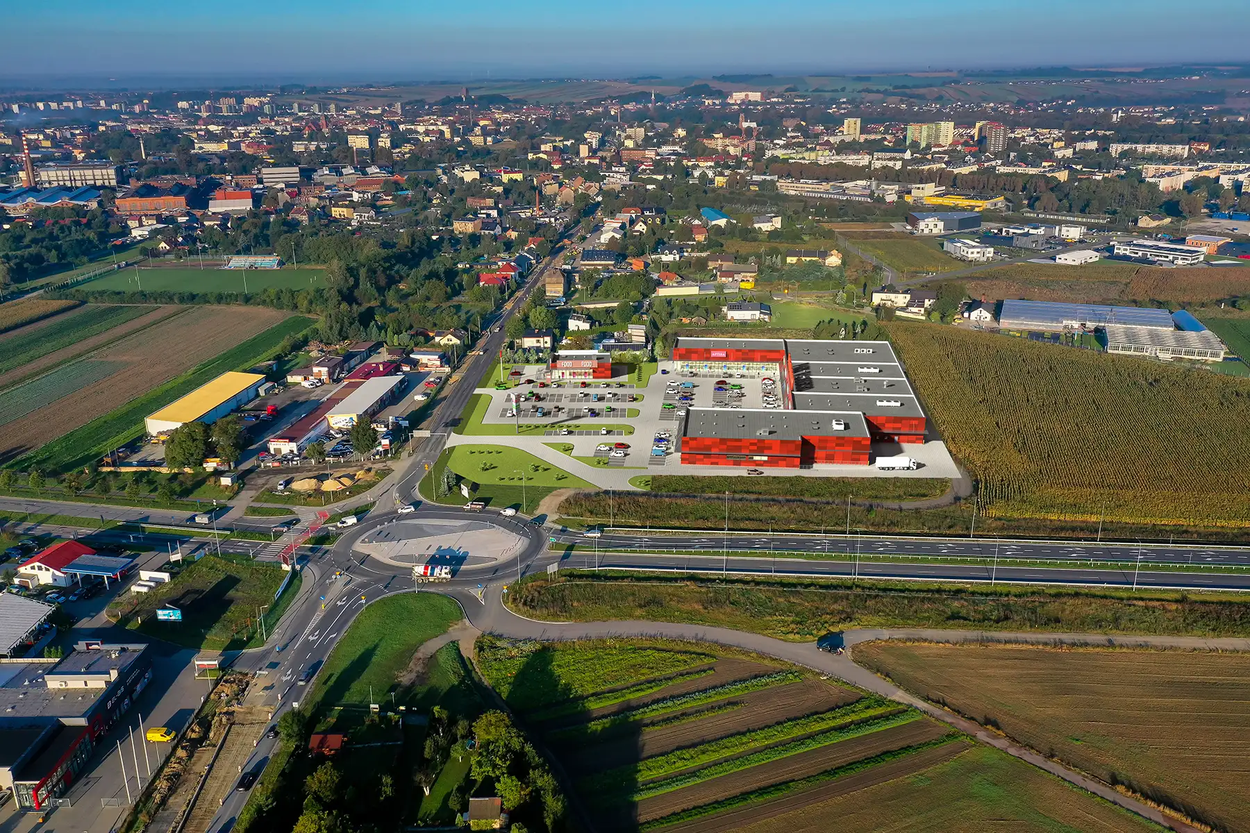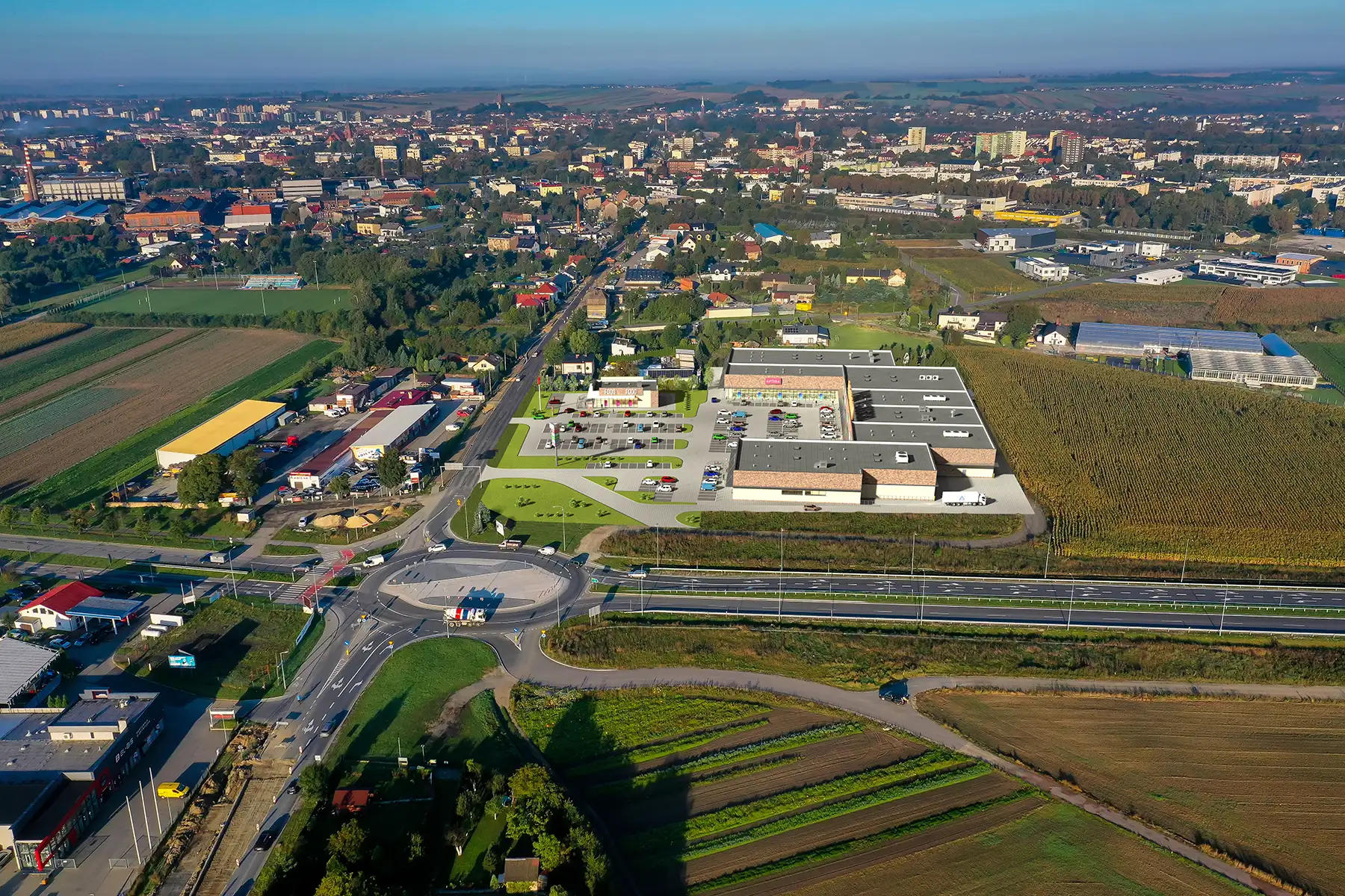 Invest 3D Wizualizacje architektoniczne 3D Centrów Handlowych na tle zdjęć z drona. Prace obejmują budynki, parkingi, tereny zielone, samochody na parkingu, sylwetki ludzi. ← RSBRE