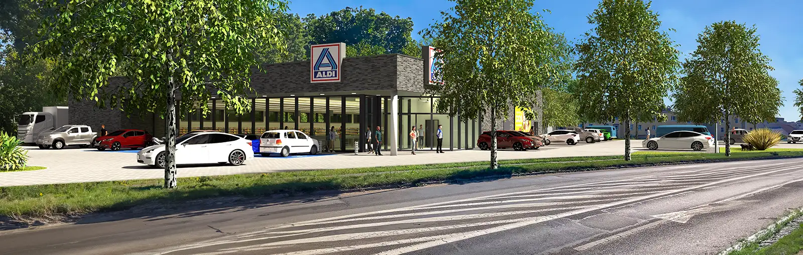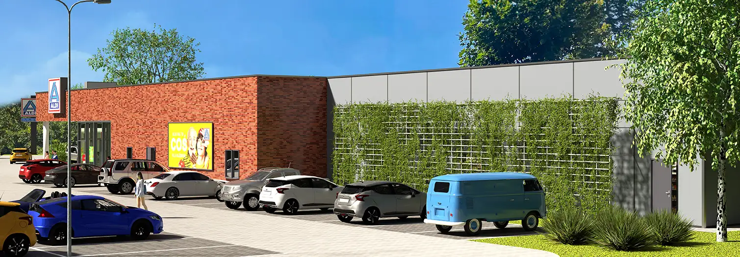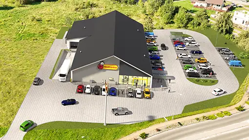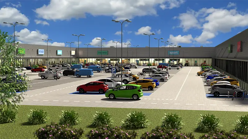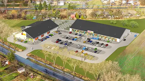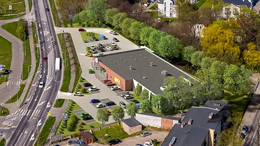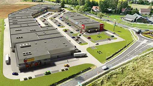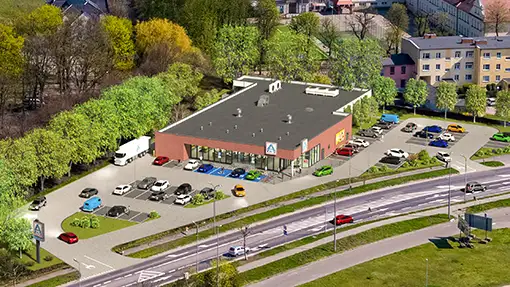 Tworzymy wizualizacje 3D nowych sklepów dla sieci handlowych. Aby uzyskać większy stopień realizmu, dostosowujemy wizualizacje do serii zdjęć wykonanych za pomocą drona. Dzięki temu inwestorzy i inne zainteresowane strony mają możliwość oglądania przyszłej inwestycji w autentycznym otoczeniu, mogą przyjrzeć się szlakom komunikacyjnym i pobliskiej zabudowie mieszkalnej. Ponadto, trójwymiarowe wizualizacje architektoniczne stanowią skuteczną formę przekonywania lokalnych władz do planowanej inwestycji.